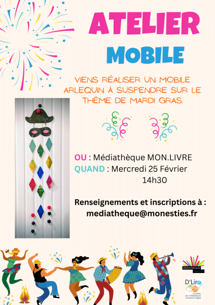 carnaval Affiche_mobile.png Atelier gratuit pour les enfants à partir de 4 ans Catégorie Atelier Détails des prochaines sessions Le mercredi 25 février 2026 de 14:30 à 17:00 Ical Public Enfants Prochaines sessions