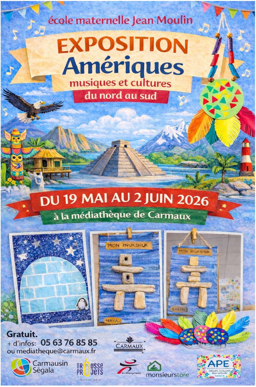 Pour leur 4ème voyage autour du monde, les élèves de l’école maternelle Jean Moulin vous invitent à un grand périple musical et culturel à travers le continent américain, de l’Alaska jusqu’à la Terre de Feu.